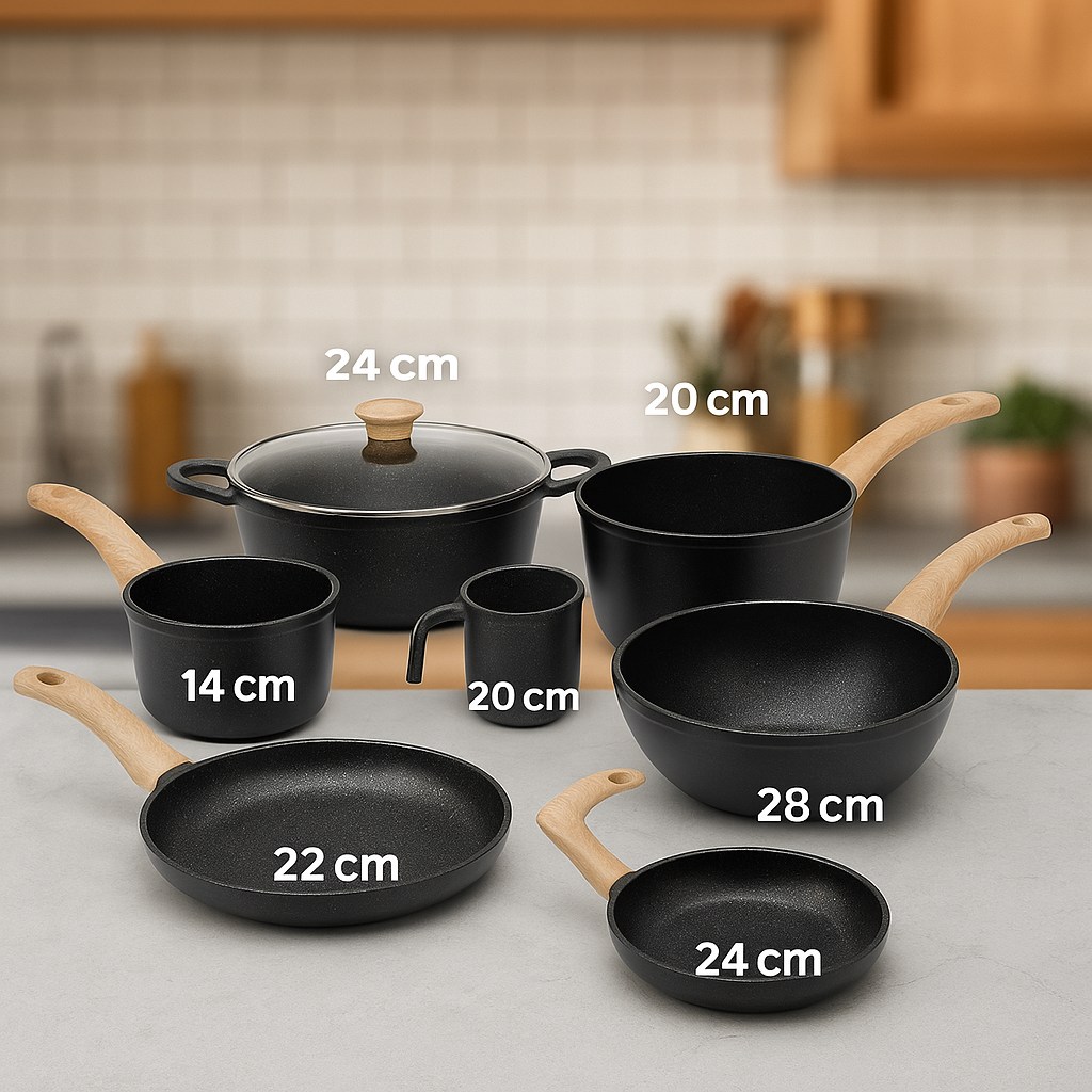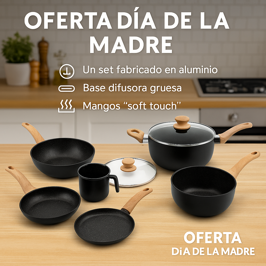 Un set fabricado en aluminio, con 2,5 mm de espesor, base difusora de calor, doble capa antiadherente y mangos realizados con tecnologĂ­a "soft touch", que permiten manipular los utensilios sin quemarse durante la cocciĂłn.